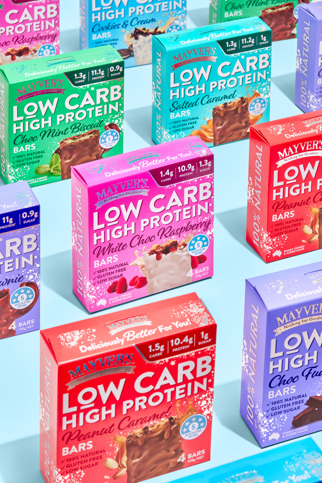 They have been created to achieve the best nutritionals in market in terms of lowest carbs, highest protein, lowest sugar etc. All our Low Carb High Protien bars acheive a 5 health star rating. Each bar is 32g in size.