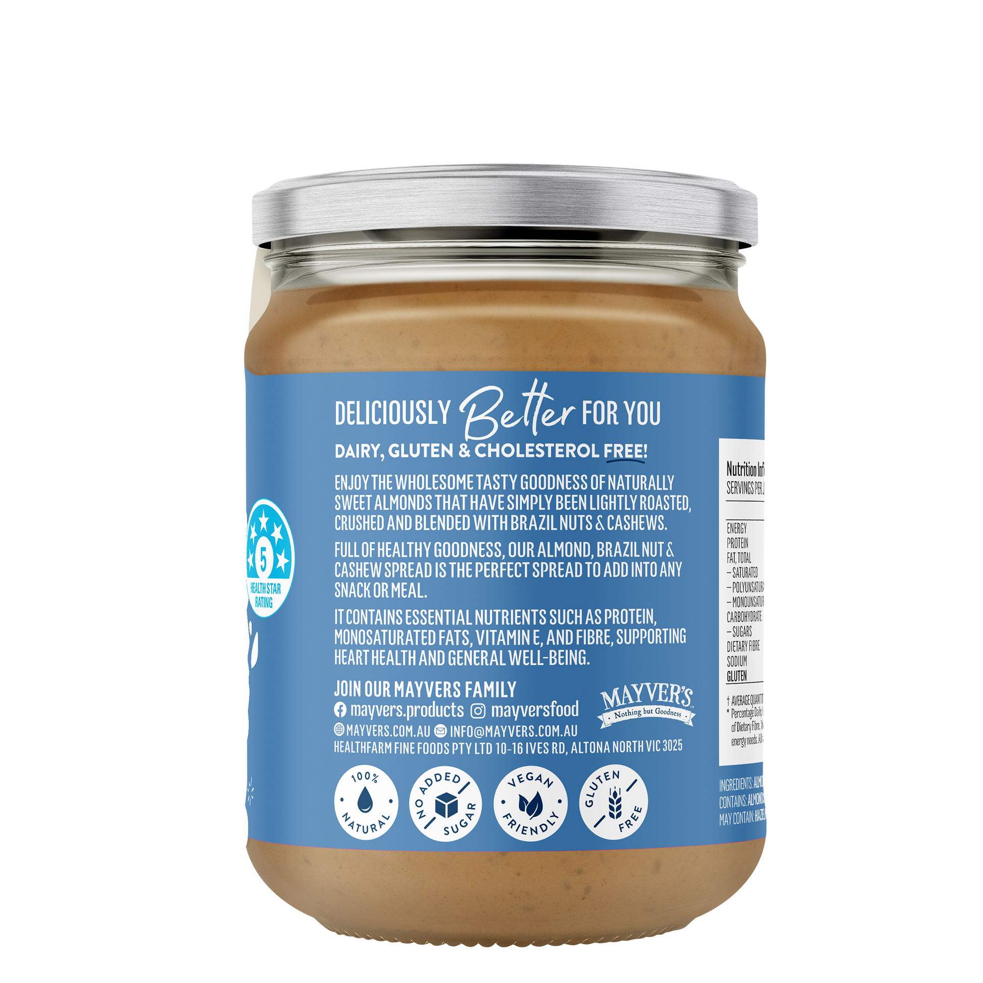Mayver's Almond, Brazil Nuts & Cashew Spread is a nourishing blend of nuts packed full of essential vitamins and minerals! Brazil Nuts are an excellent source of selenium , which is an essential trace element for the proper functioning of our thyroid and immune system! Enjoy the wholesome goodness of natural almonds, brazil nuts and cashews, which have been carefully selected then lightly roasted and ground to perfection giving it a naturally sweet tasting, smooth texture!