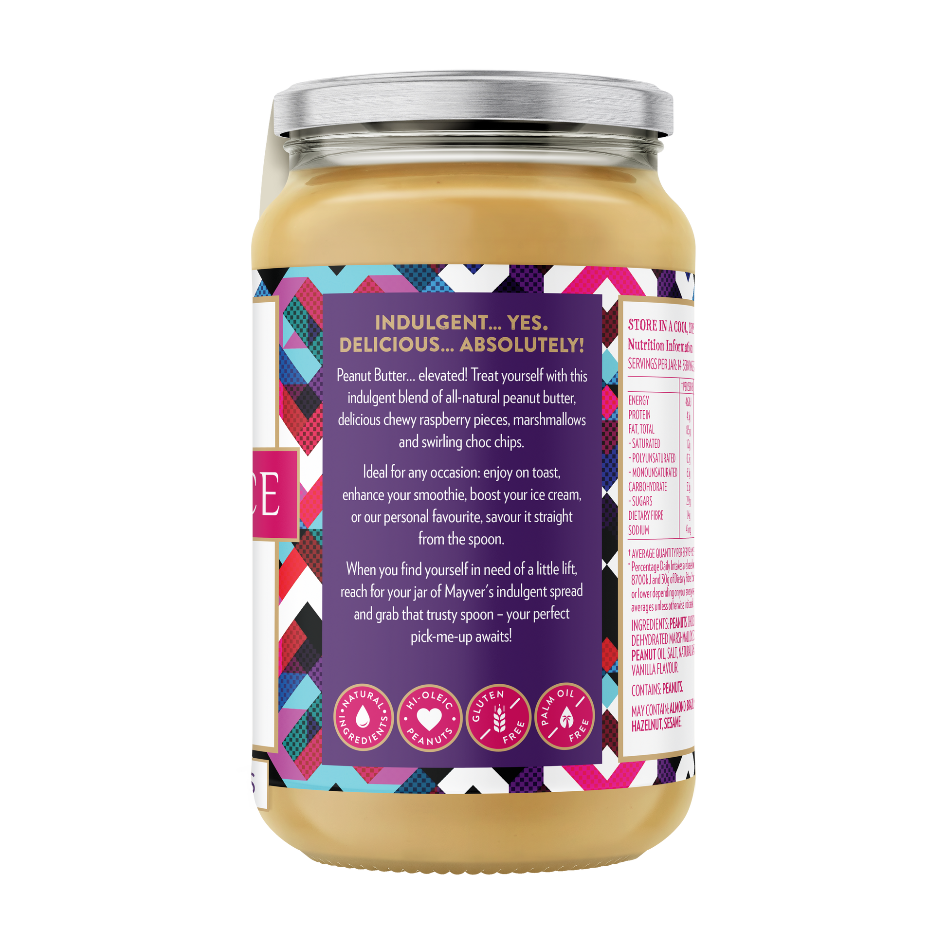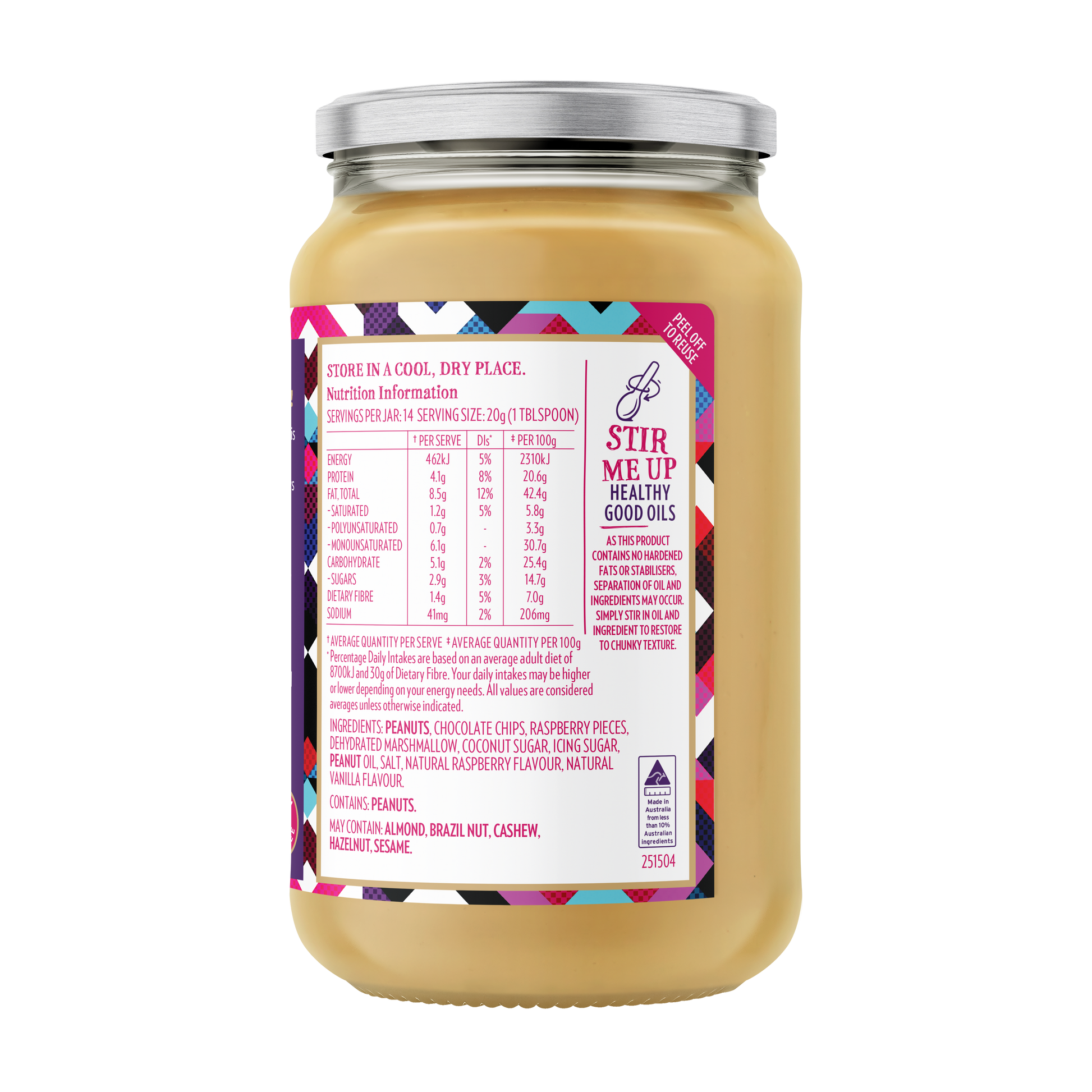 Treat yourself with this indulgent blend of all-natural peanut butter, delicious chewy raspberry pieces, marshmallows and swirling choc chips! Ideal for any occasion: enjoy on toast, enhance your smoothie, boost your ice cream, or our personal favourite, savour it straight from the spoon.
