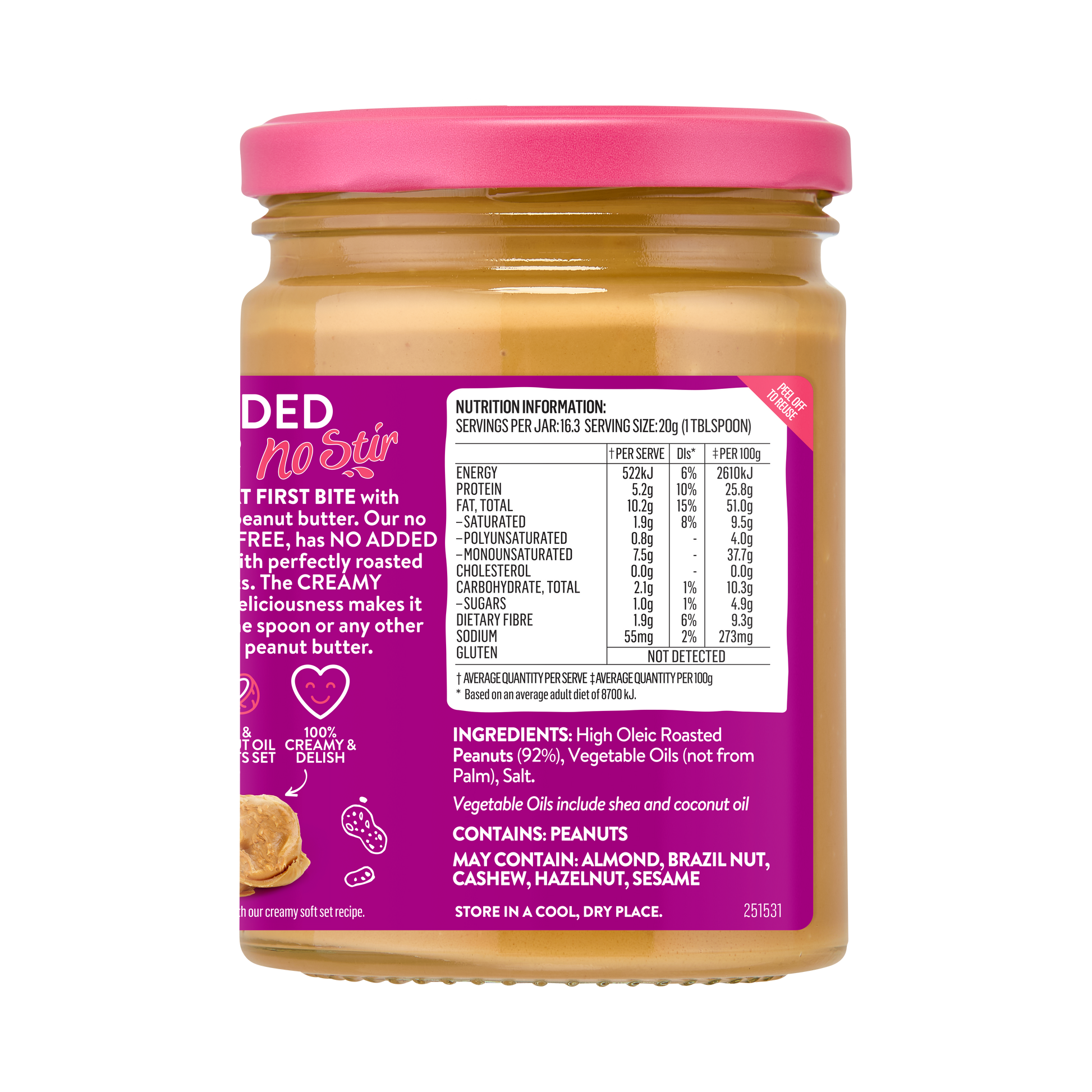 Stabilised peanut butter has the addition of a stabiliser, which is an oil or fat (most other brands in Australia use palm oil or vegetable oils) that combines with the natural peanut oil to stop or minimise the separation of the oils. in our new Lovli Spoon range we have used a delicious blend of shea & coconut oil, resulting in a healthier no stir creamy melt in your mouth texture! Plus it's also 4.5 health star rated and contains no emulsifiers and ingredients that are numbers!