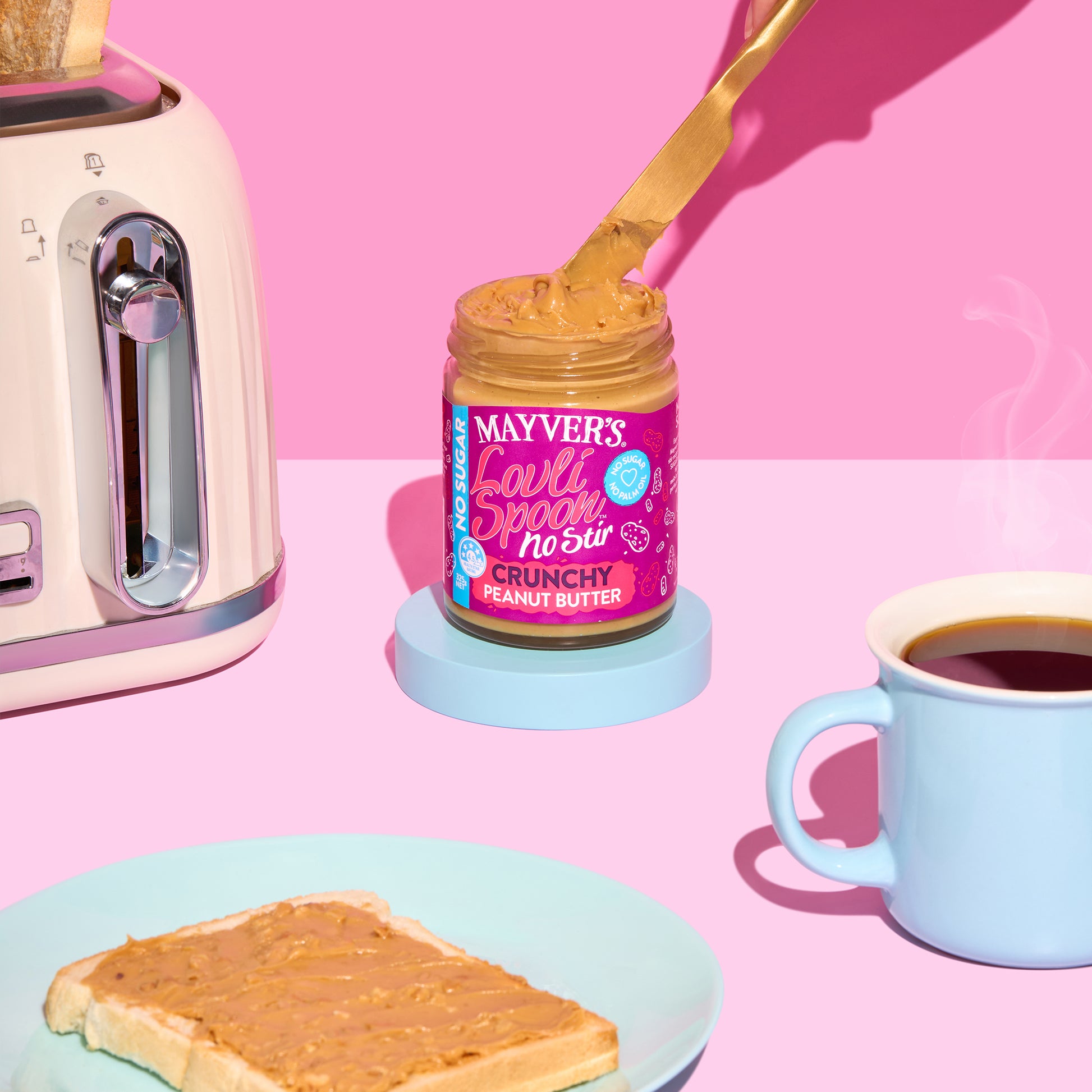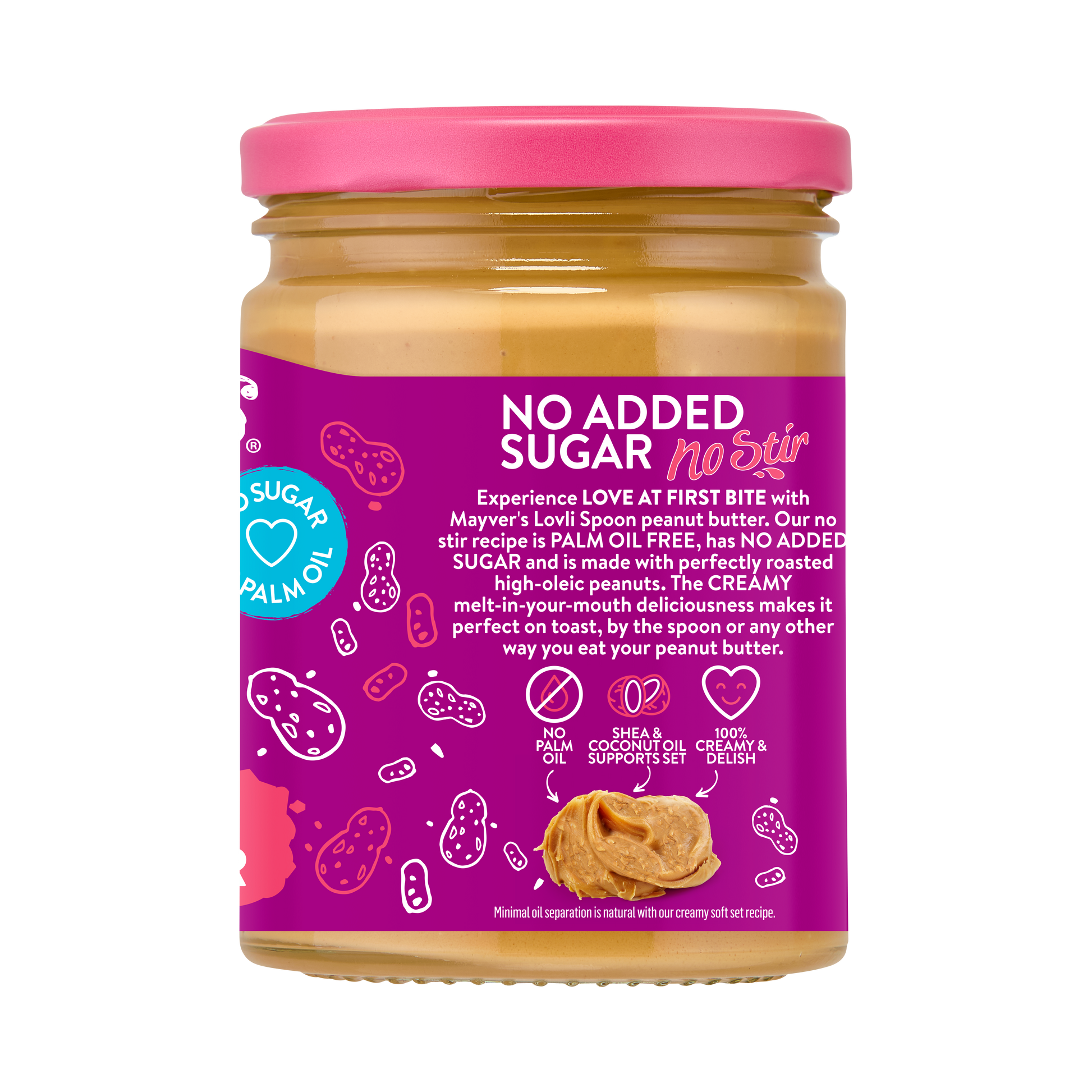 Experience love at first bite with Mayver's Lovli Spoon peanut butter. Our no stir recipe is Palm Oil free, has NO added sugar and is made with perfectly roasted high-oleic peanuts. The creamy melt-in-your-mouth deliciousness makes it perfect on toast, by the spoon or any other way you eat your peanut butter.