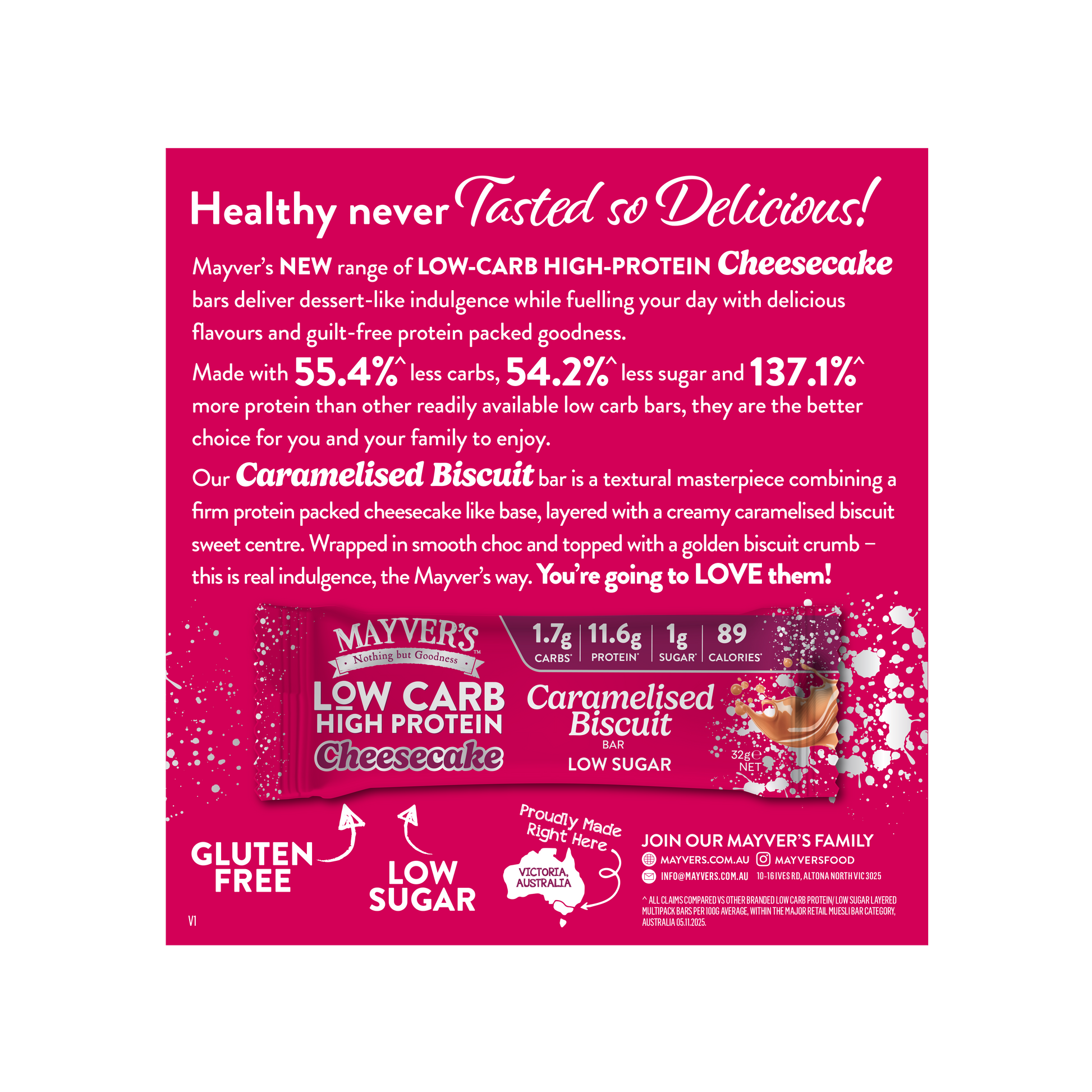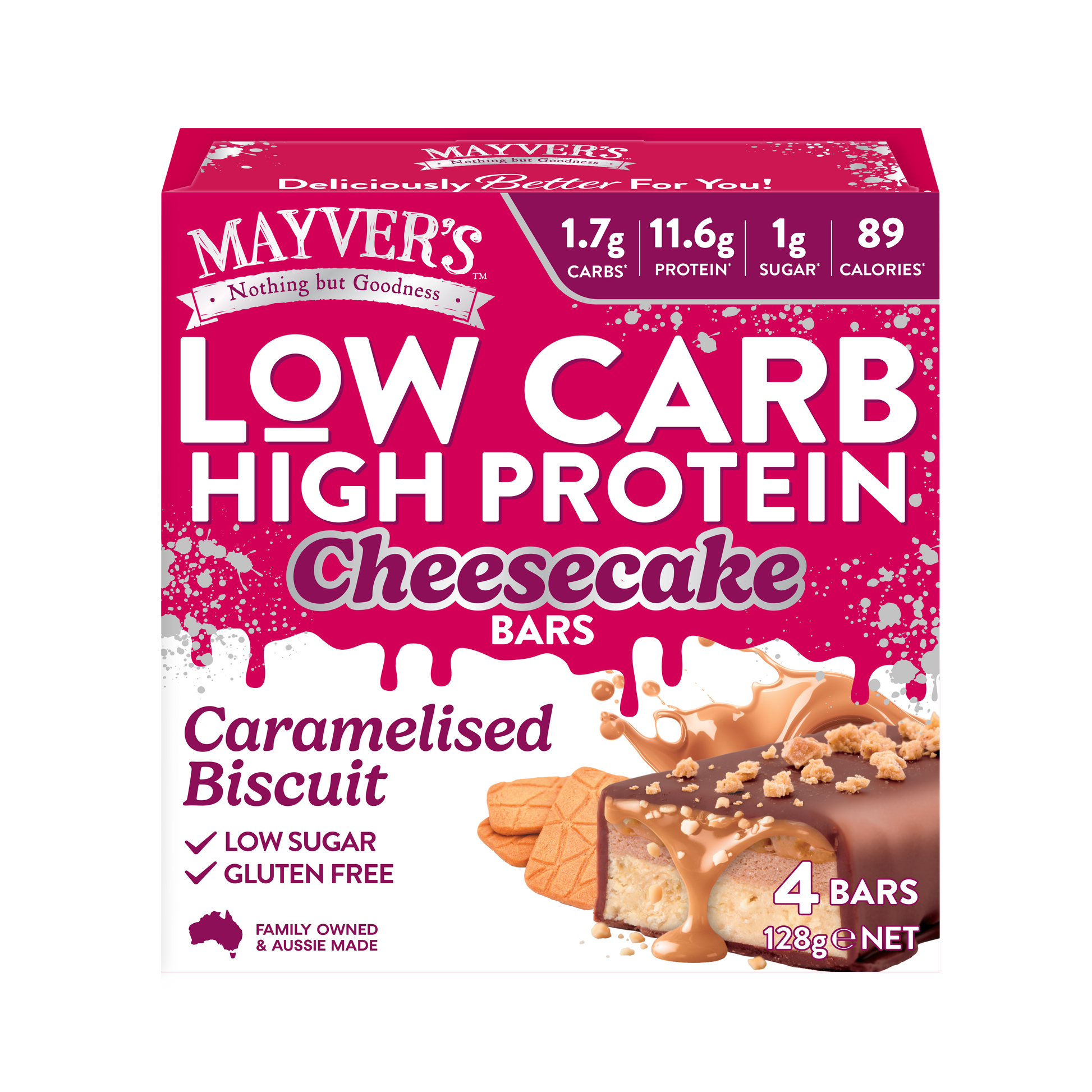 Our Caramelised Biscuit bar is a textural masterpiece combining a firm protein packed cheesecake like base, layered with a creamy caramelised biscuit sweet centre. Wrapped in smooth choc and topped with a golden biscuit crumb – this is real indulgence, the Mayver’s way. You’re going to LOVE them!
