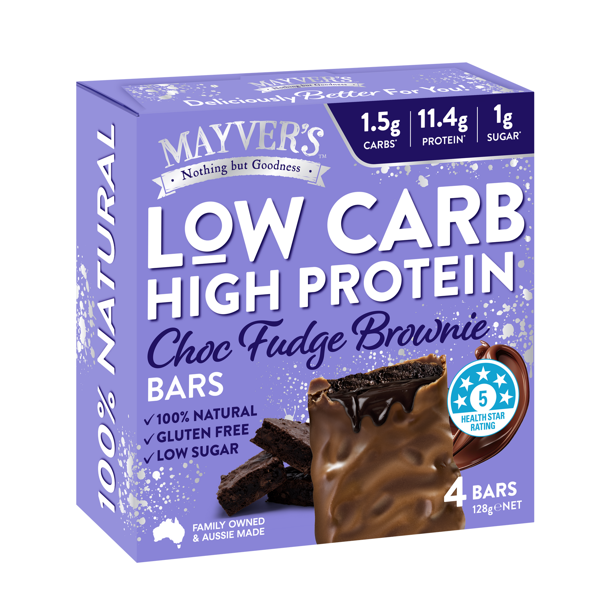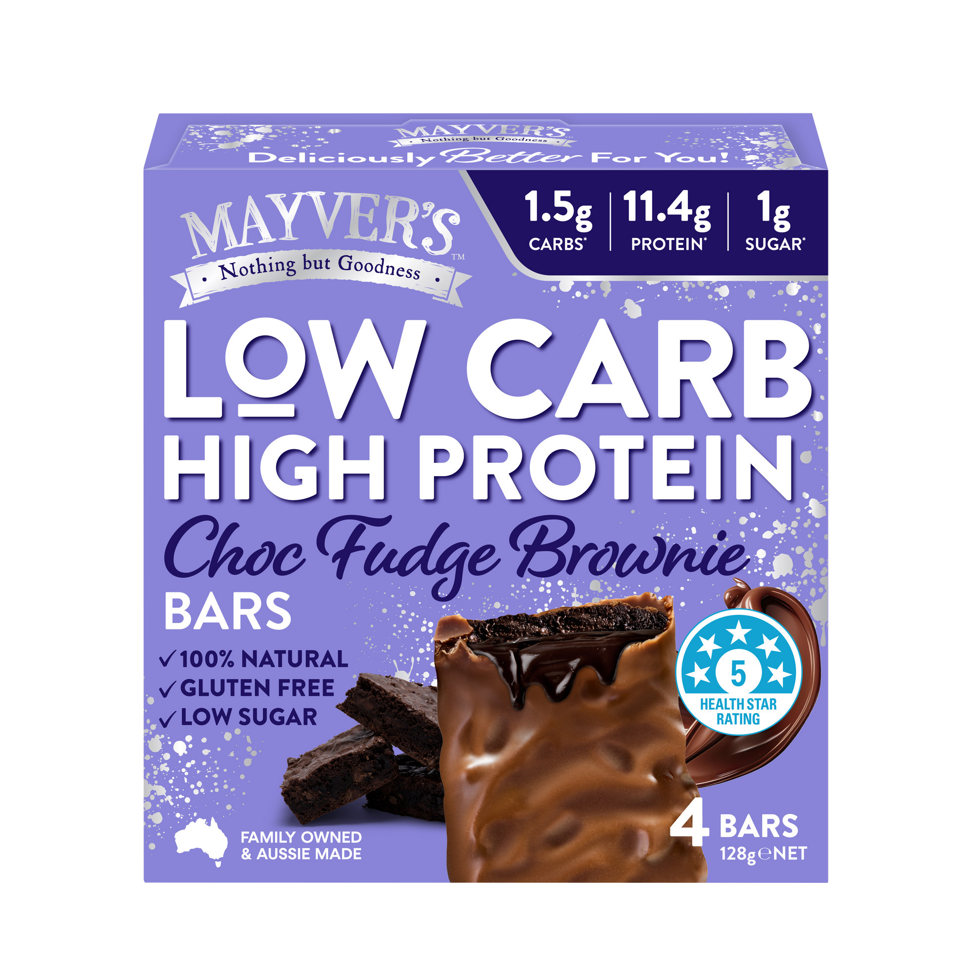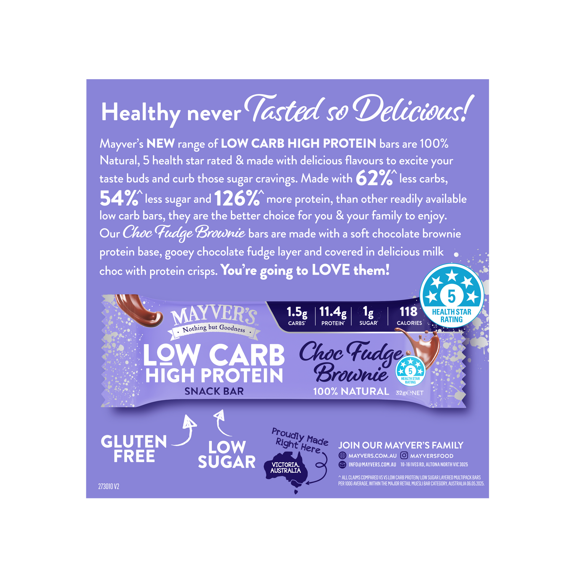 Our Mayver's Choc Fudge Brownie Low Carb High Protein bars are 100% Natural, 5 health star rated & made with delicious flavours to excite your taste buds and curb those sugar cravings.