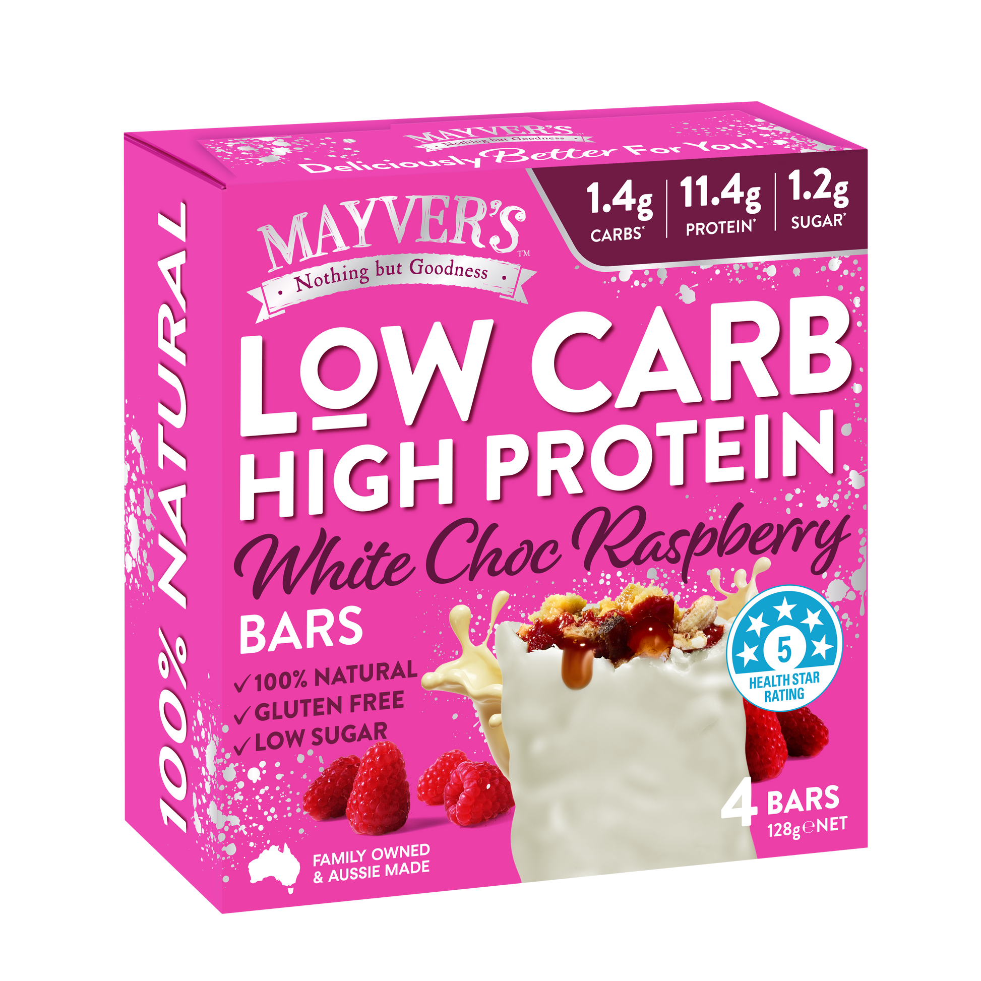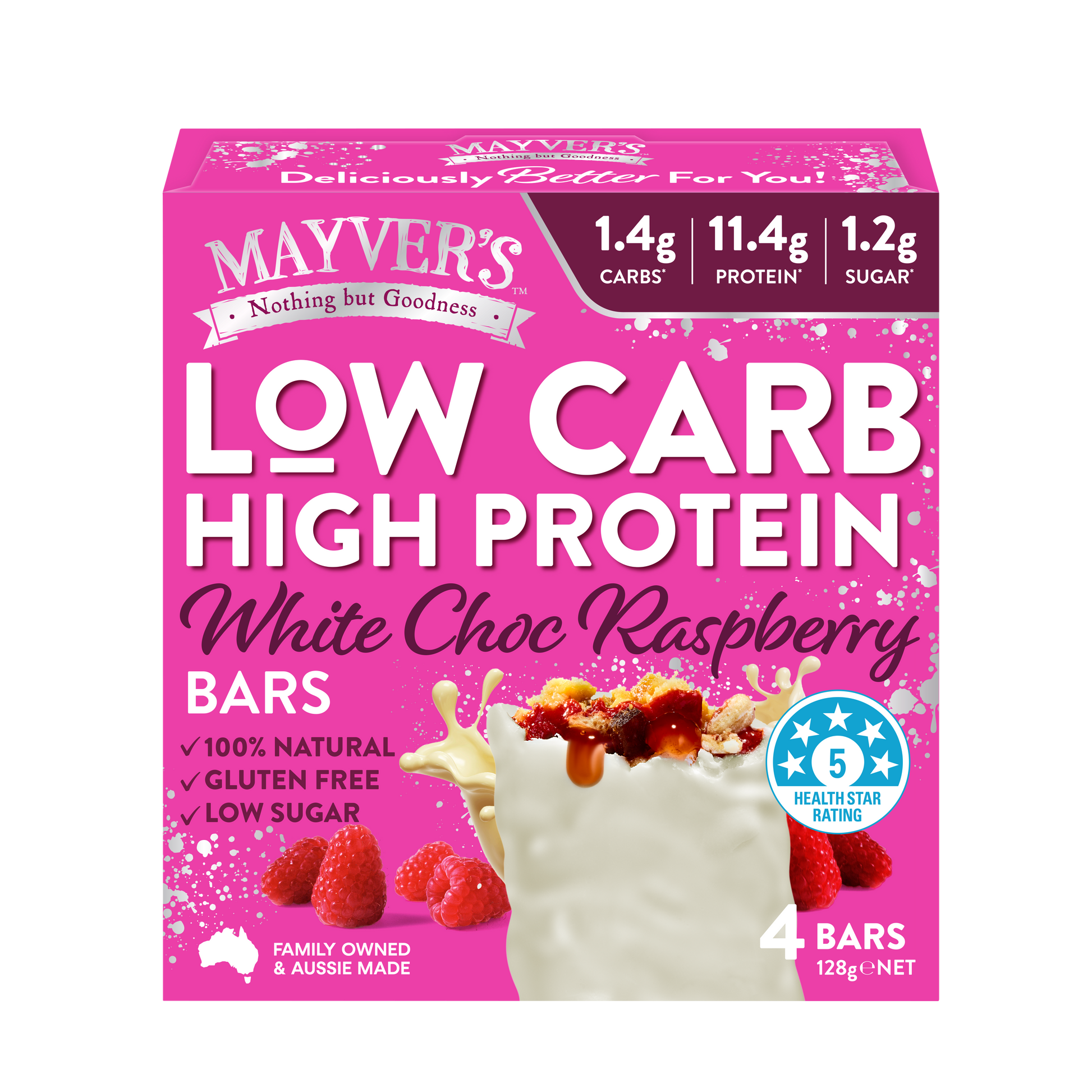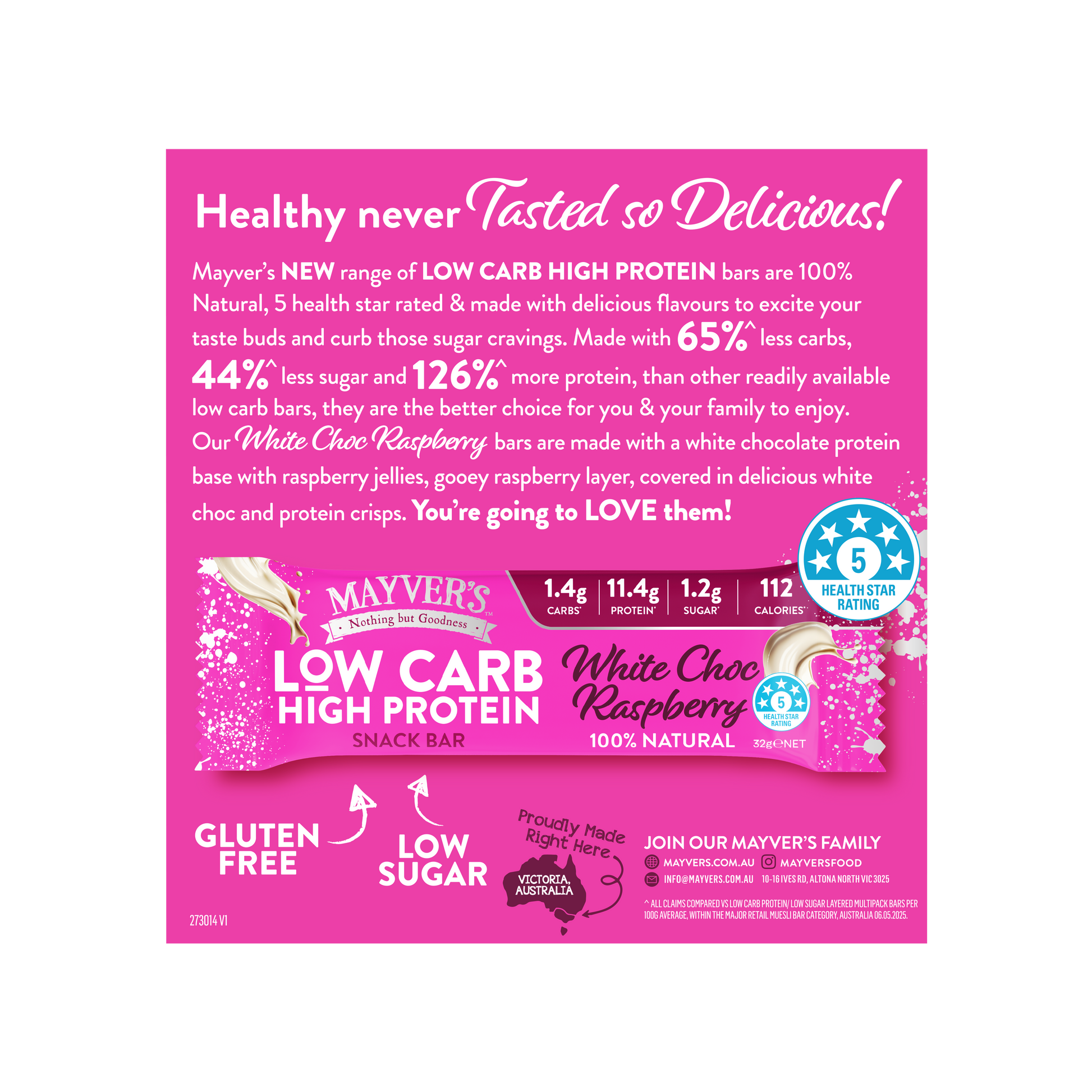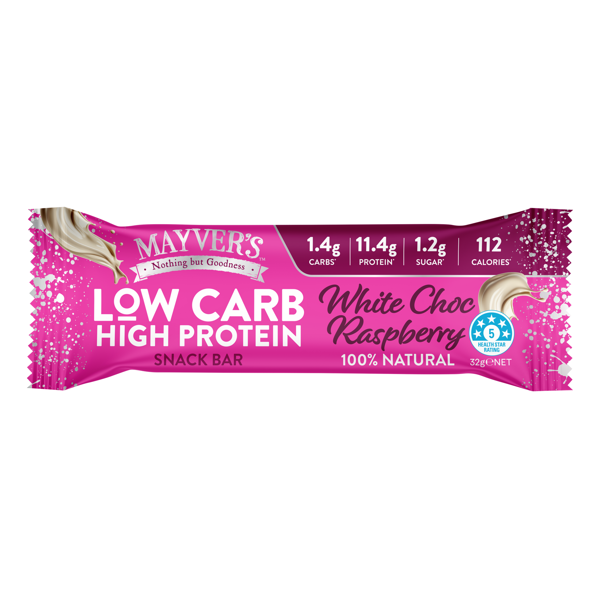 Mayver's Low Carb Higfh Protien White Choc Raspberry bars are 100% Natural, 5 health star rated & made with delicious flavours to excite your taste buds and curb those sugar cravings.