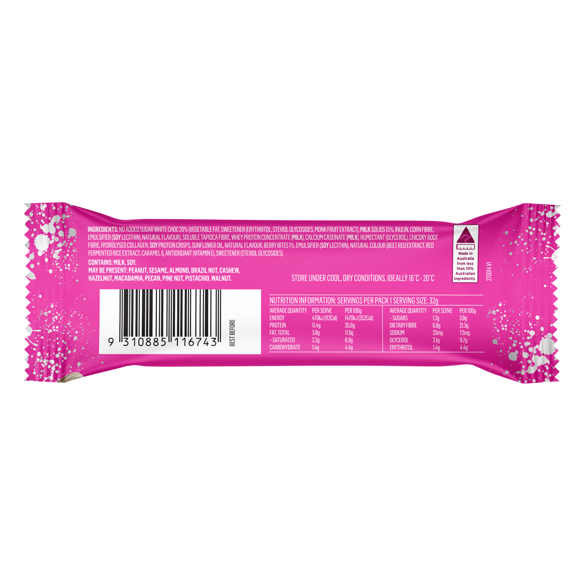 Our White Choc Raspbey bars are made with a white chocolate protein base with raspberry jellies, gooey raspberry layer, covered in delicious white choc and protein crisps. You’re going to LOVE them!